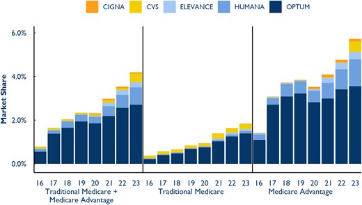 “Insurer control of primary care is expanding, concentrated in areas with robust Medicare Advantage enrollment and less concentrated hospital markets.” UnitedHealth’s Optum is leading the charge with Humana in second place.